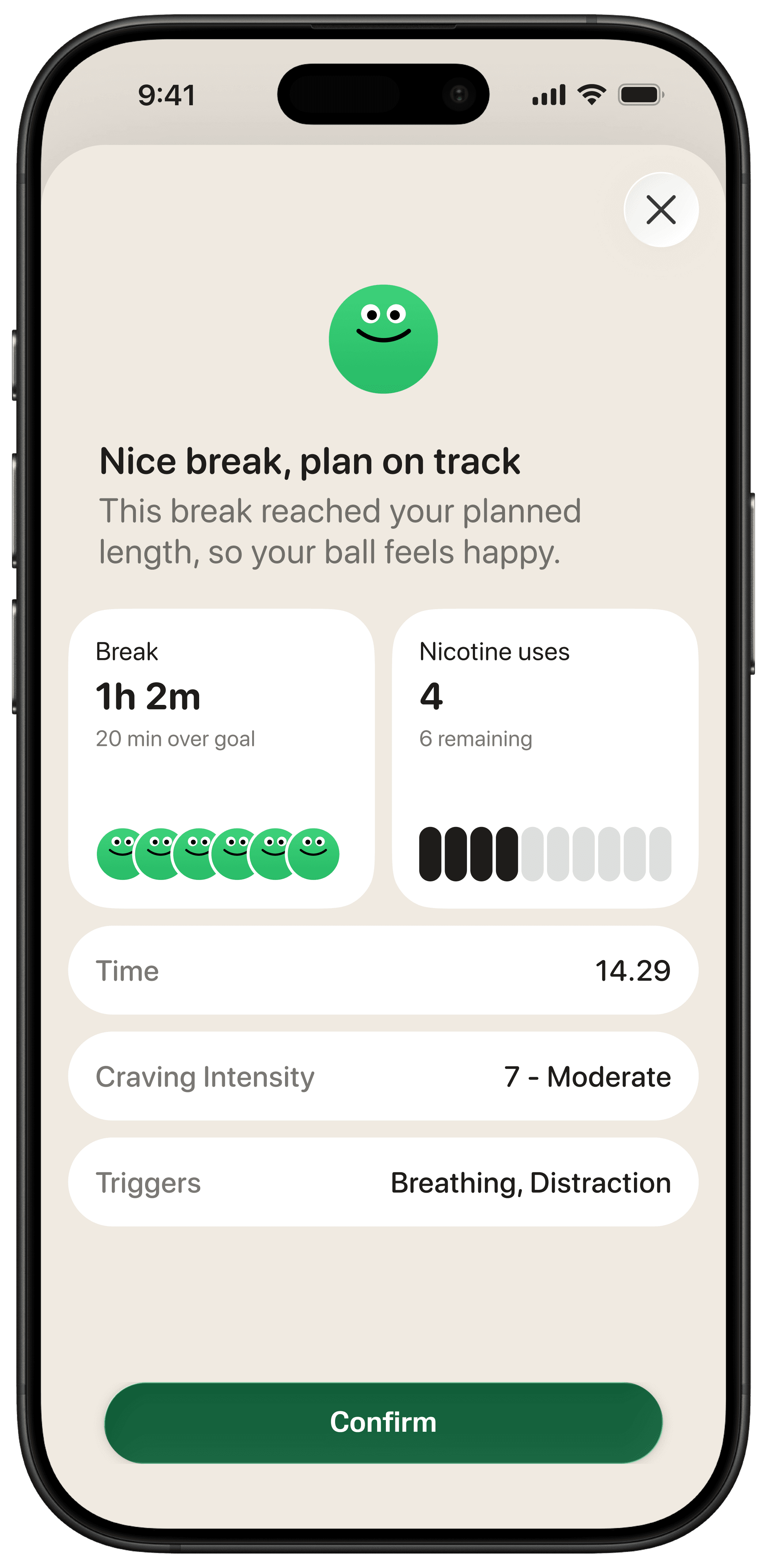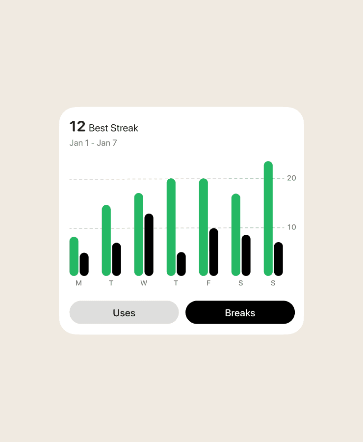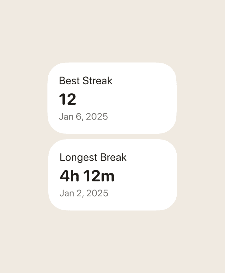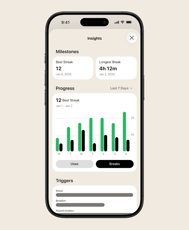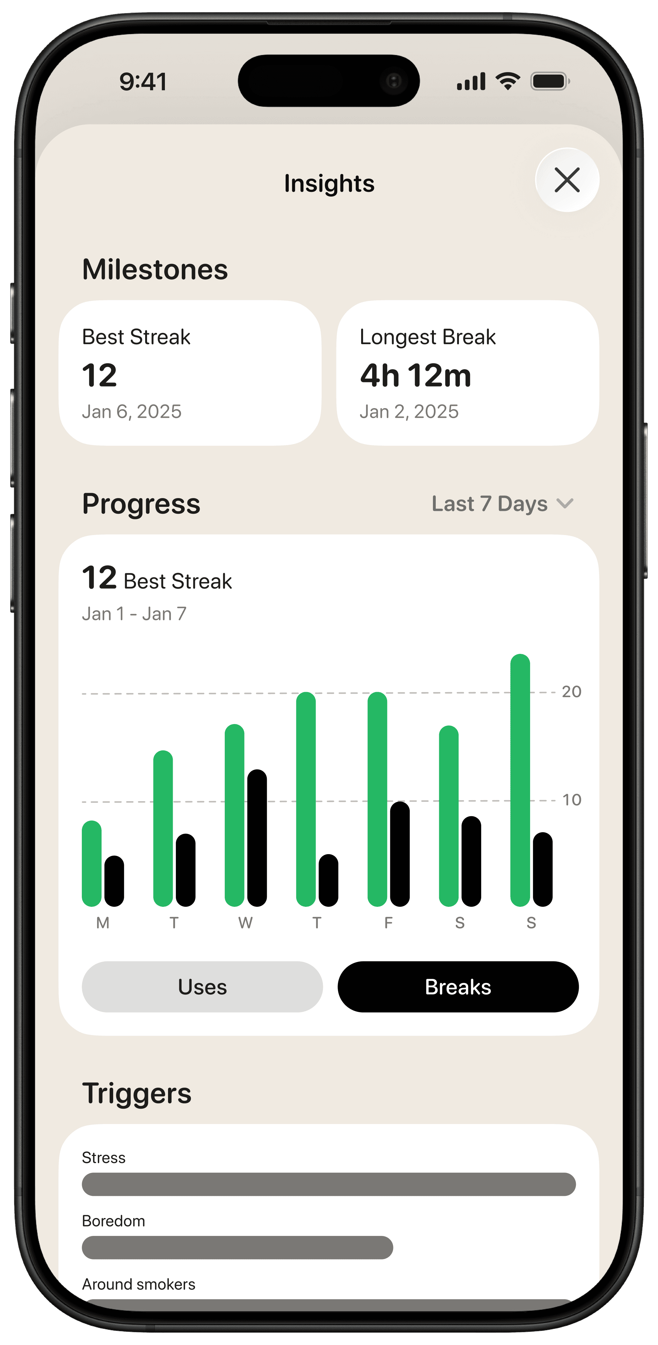 Understand what's working and what's not. Track successful breaks, spot your triggers, and see how your habits evolve over time. No judgment—just honest data that helps you figure out your path forward.
