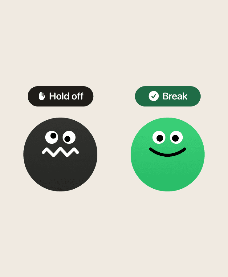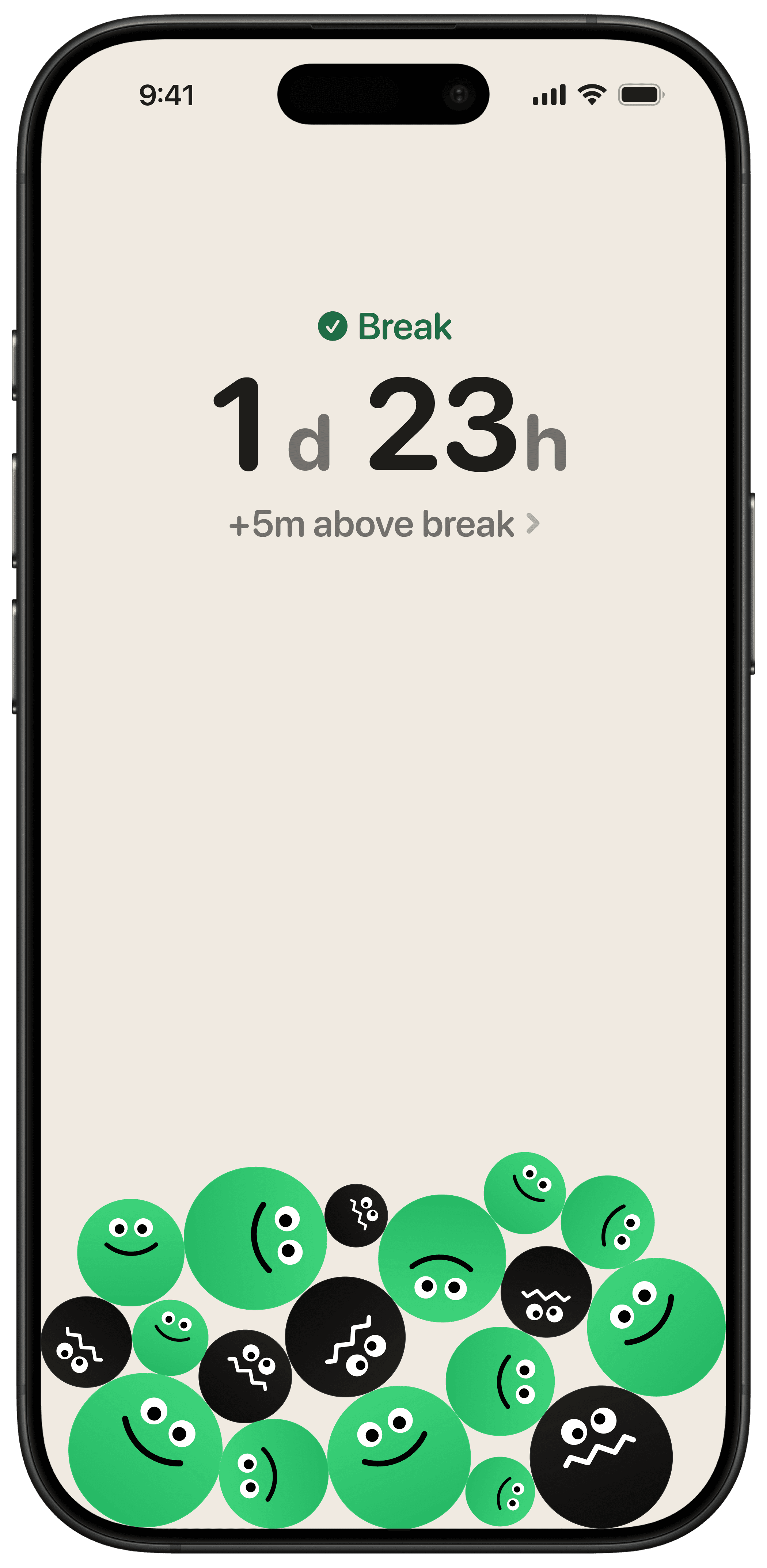 Break timers that actually feel good to watch. Hit your goal? Green ball, happy vibes. Miss it? Black ball, honest feedback. No shame, just data that helps you level up.