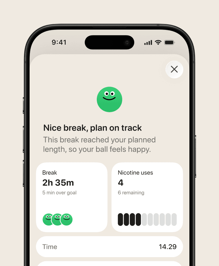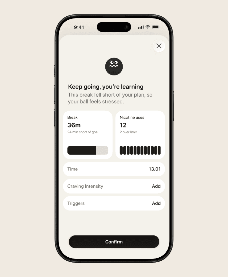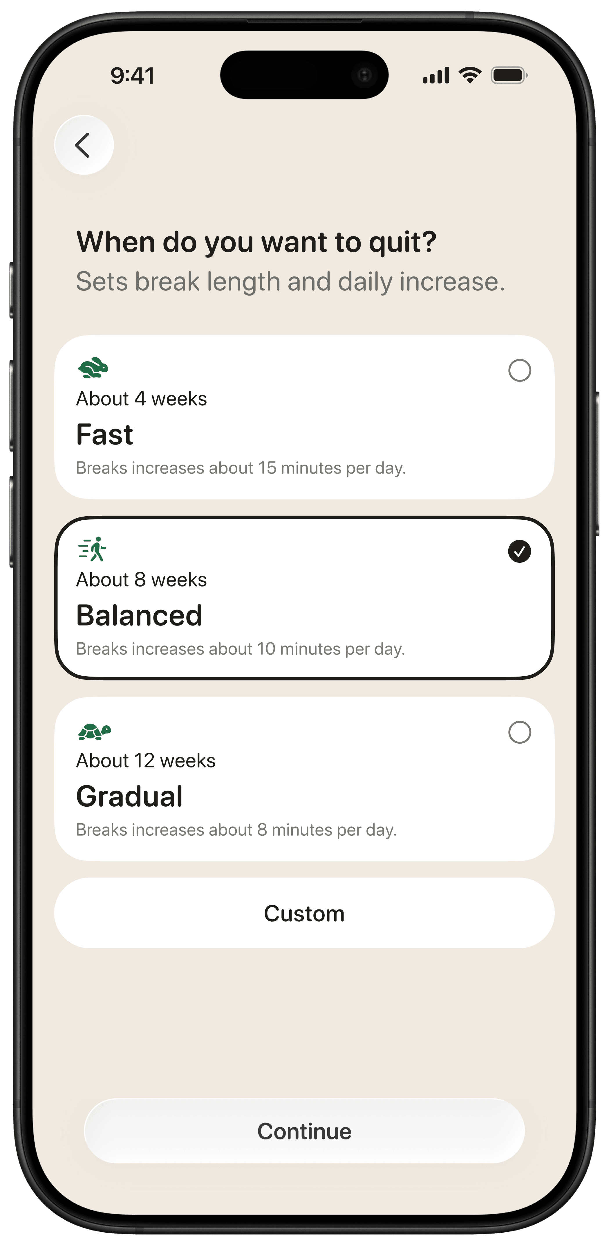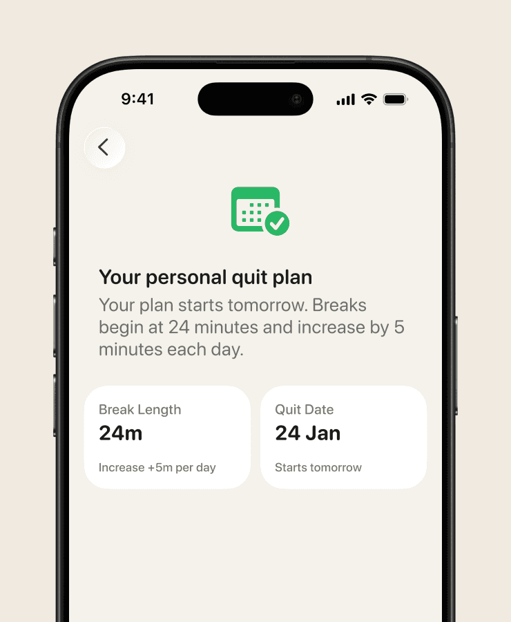 Pick your quit date, choose how fast you want to go, and get a plan that's yours. No one-size-fits-all BS—just break goals that grow with you until nicotine's out of your life.